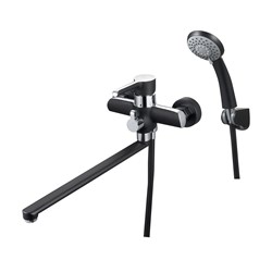 см-ль для ванной, техналогия производства литьё в песчаную форму, материал корпуса латунь (Lt), с пов. плоским изливом 360°, картридж трёхступенчатый с функцией экономии воды ø35, покрытие комбинированное хром и чёрное матовое, встр. в корпус картриджное переключение на душ. 10шт/уп.
