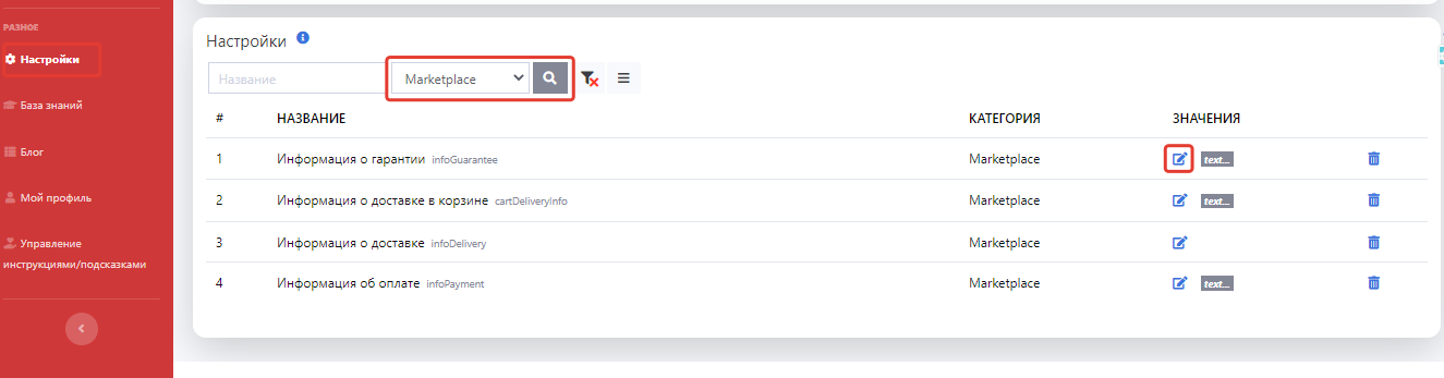 В разделе Настройки в кабинете администратора выбираем категорию Marketplace. Нажимаем Иконку формы редактирования текста и вводим текст.
