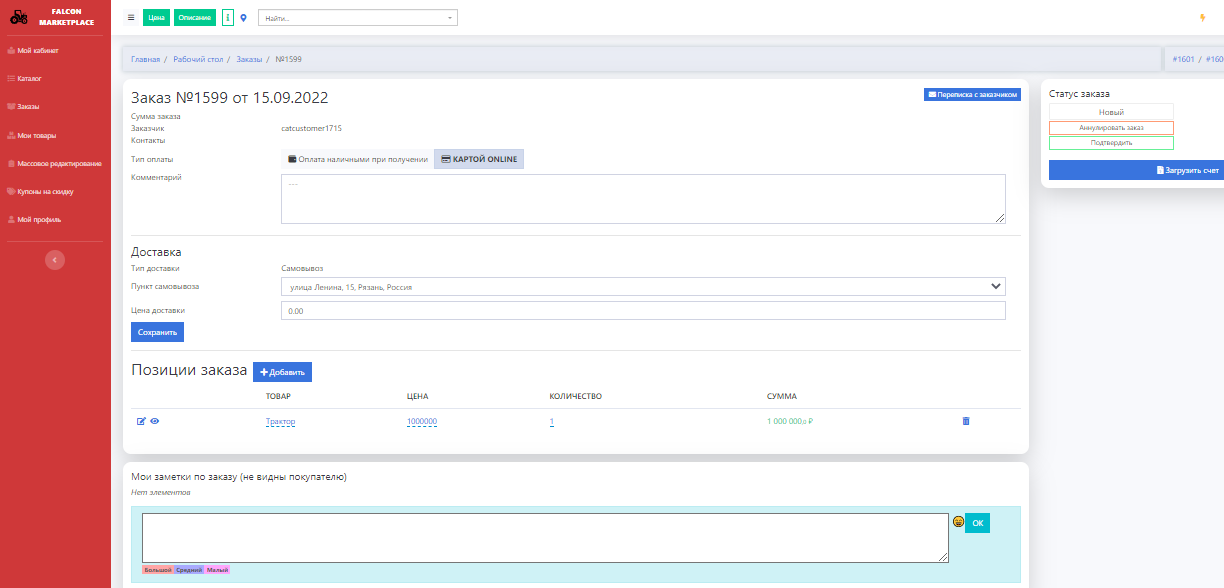 В кабинете поставщика появляется заказ со статутом Новый. Поставщик может подтвердить или аннулировать заказ.