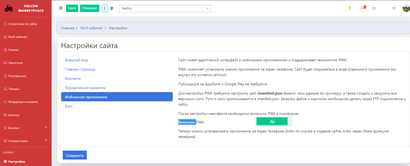 В кабинете Администратора на странице "Настройки" выбираем раздел "Мобильное приложение" и включаем переключатель Включить PWA (по умолчанию режим PWA активирован).
