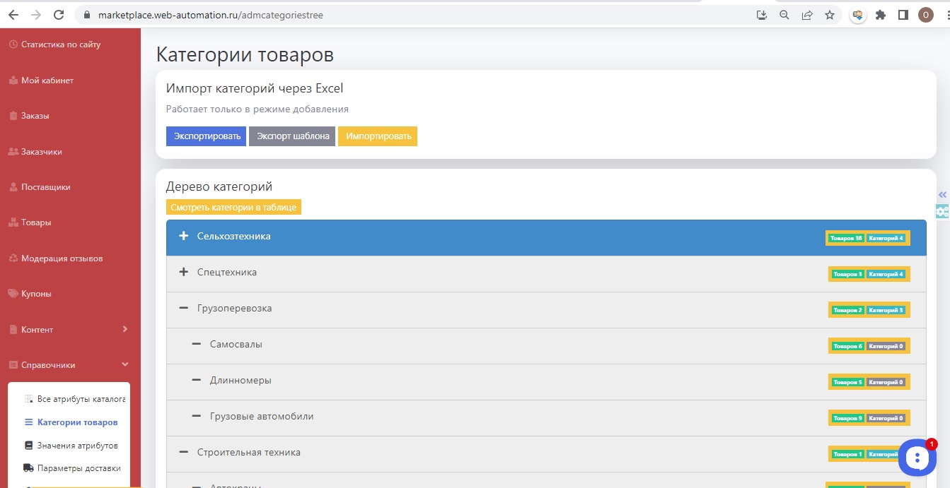 В кабинете администратора в разделе Справочники находится управление каталогом. На странице Категории товаров, можно добавить/редактировать/удалить родительскую категорию или подкатегорию. Также есть механизм массовой загрузки через Excel.