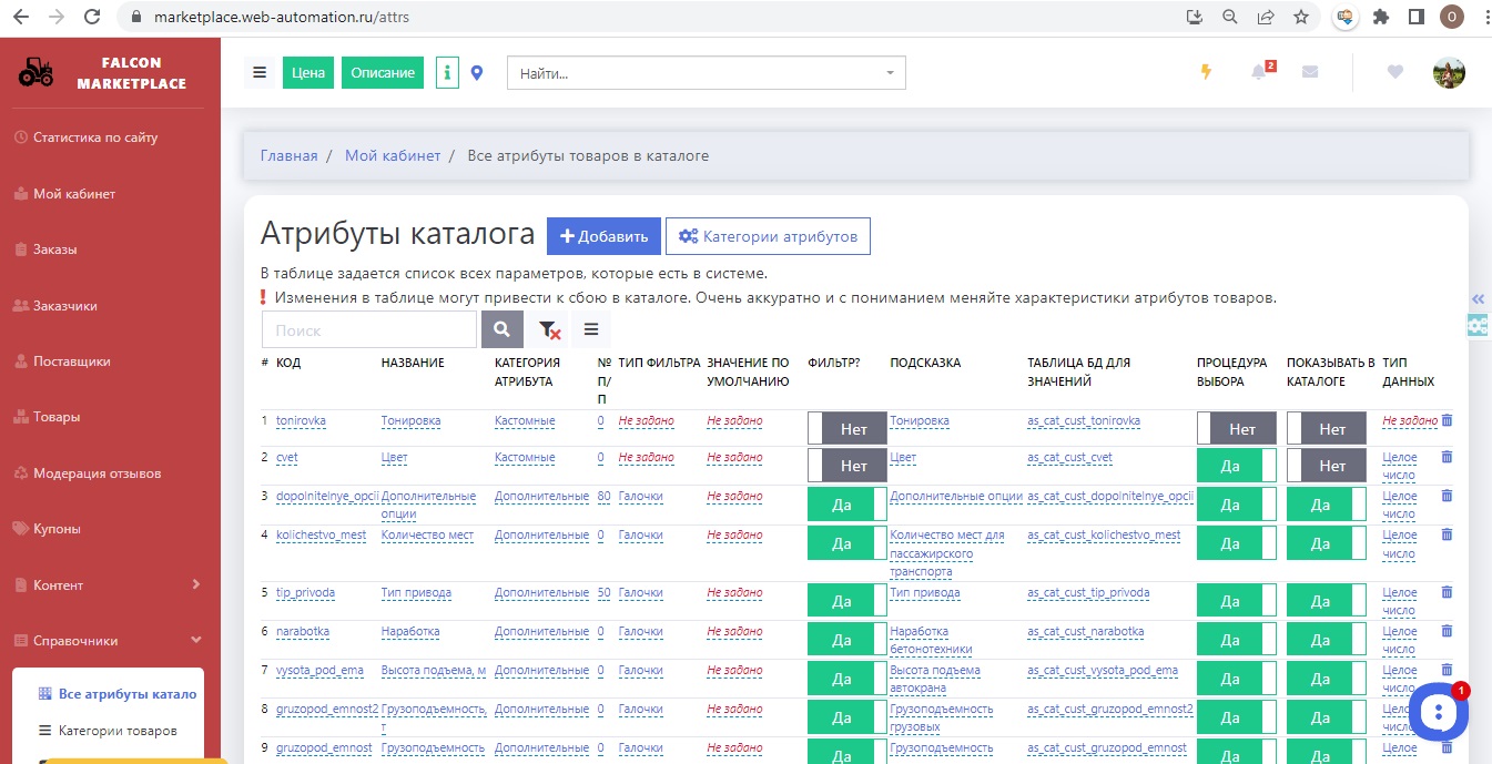 На странице Атрибуты каталога можно добавить/редактировать/удалить атрибут какой-либо категории.