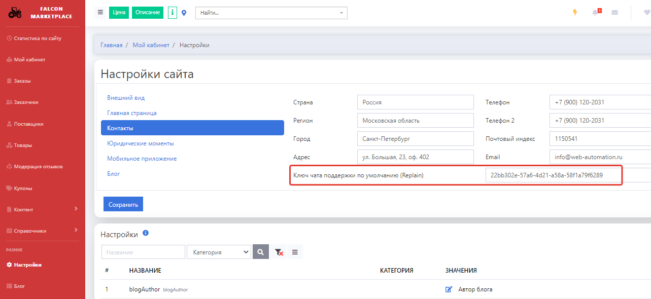 Указать этот ключ на странице Настройки в разделе Контакты.