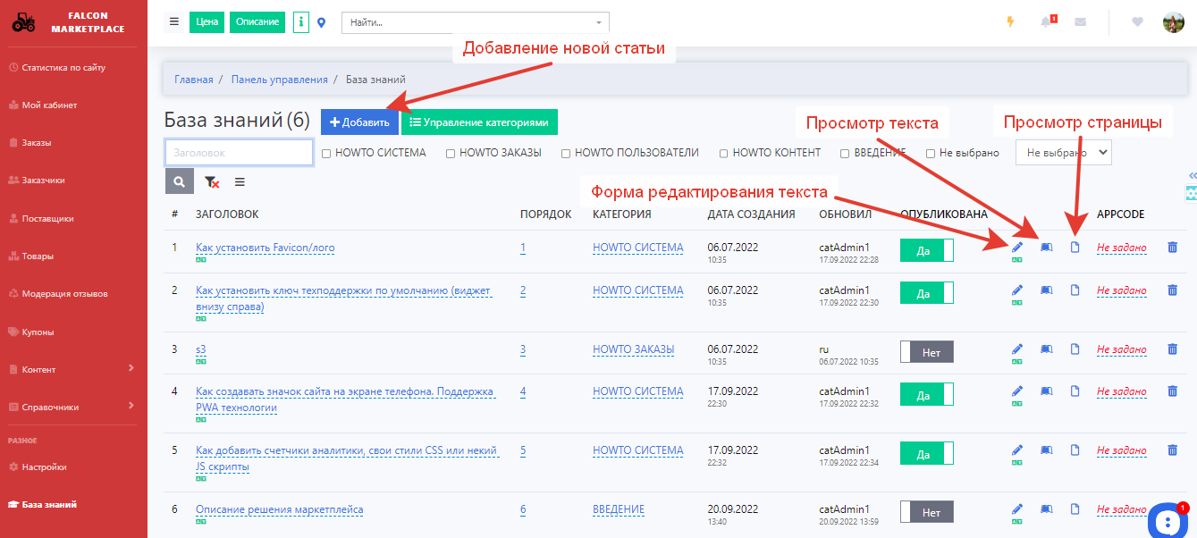 После переключения тумблера Опубликовано статья появляется в Базе знаний, пока тумблер не переключен, статья сохраняется как черновик.