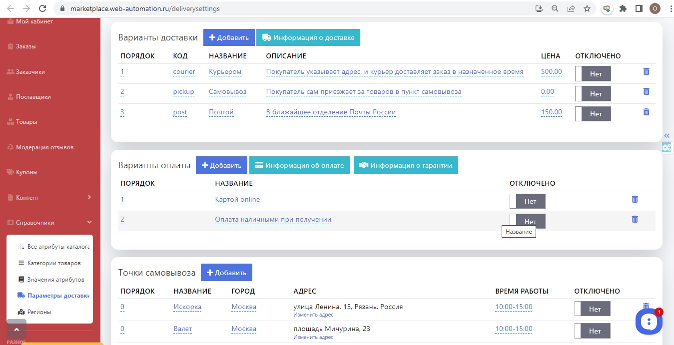 Здесь можно добавить/редактировать/удалить варианты доставки, оплаты, точки самовывоза.